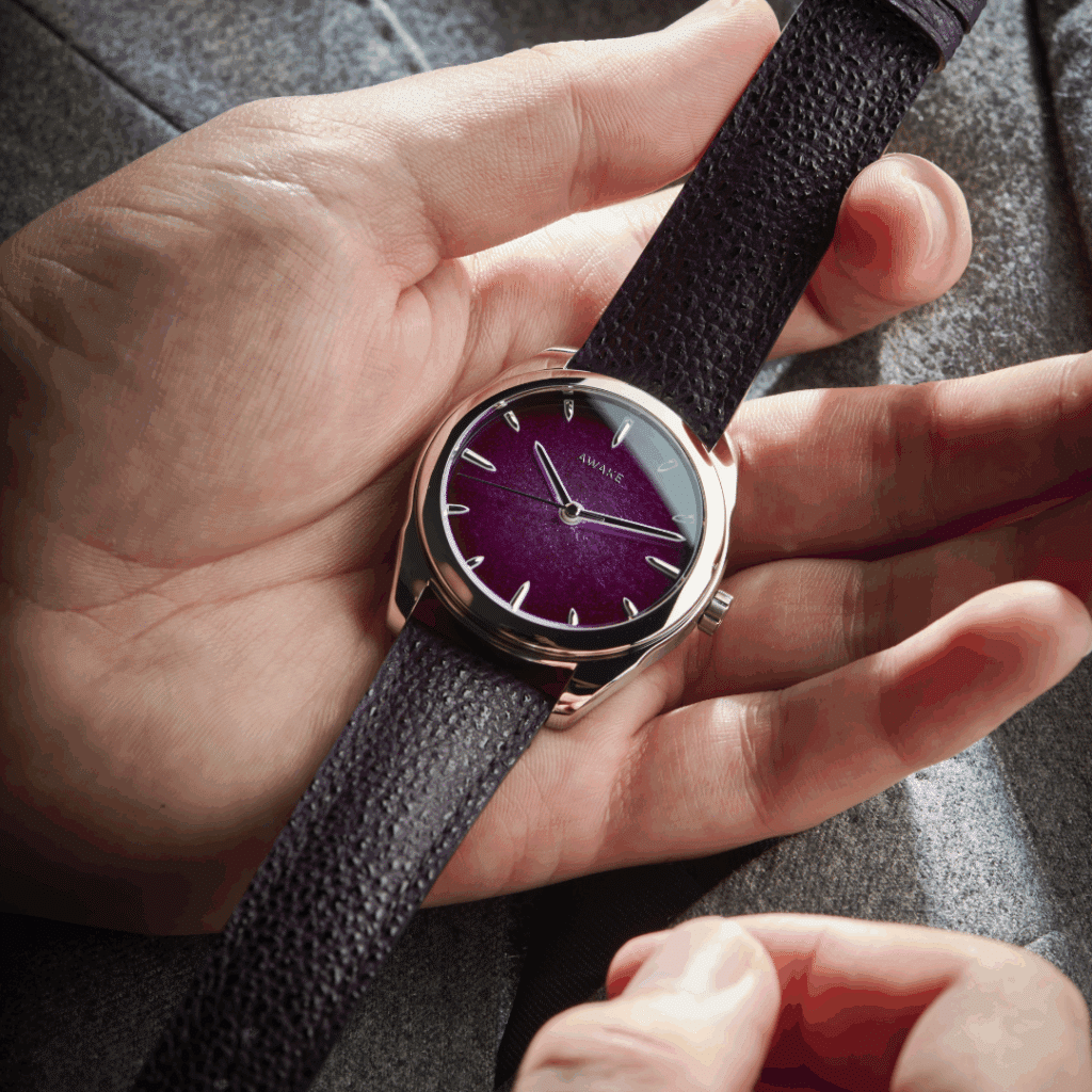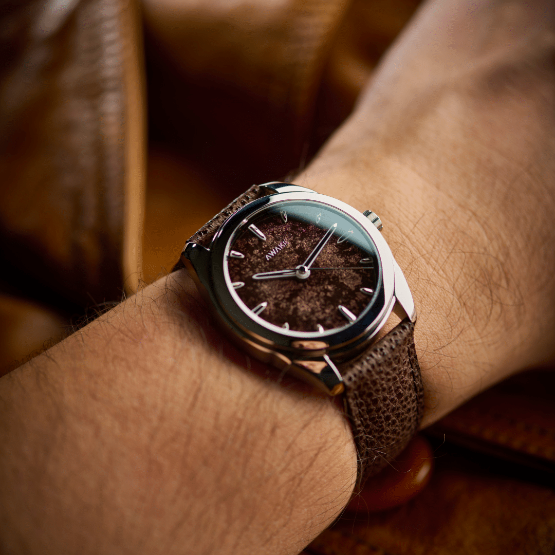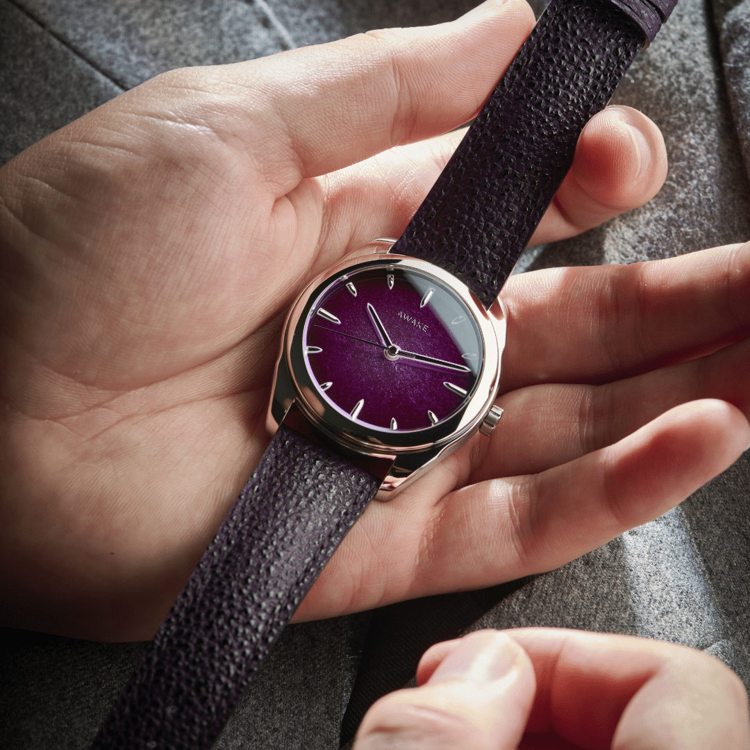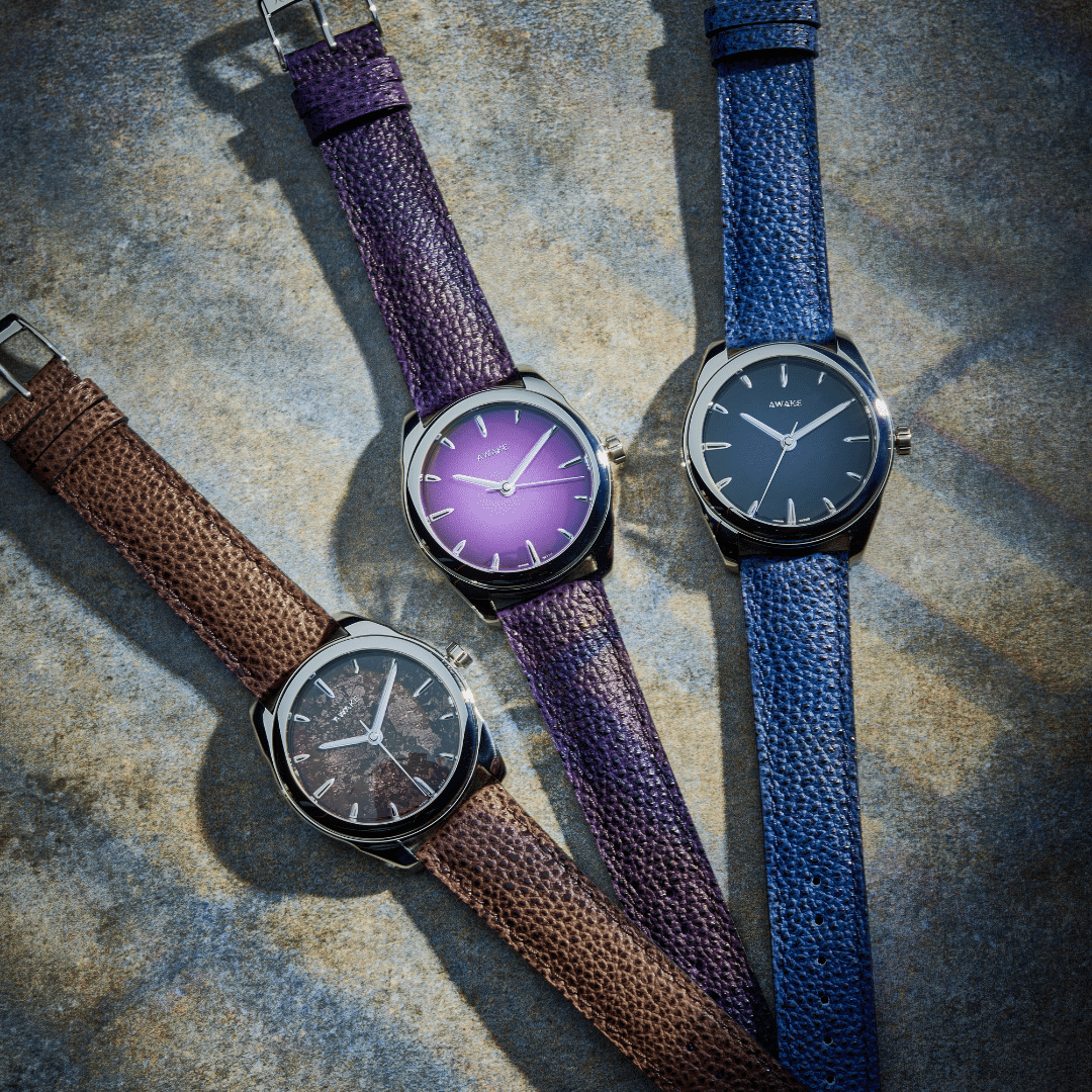 Bracelets classiques 3.5 en veau Black Diamond, présentés sur trois montres Awake des collections Son Mài Frosted Leaf et Son Mài Silver Leaf « Vignette ». Le traitement artisanal de leurs cadrans, basé sur des techniques de laque traditionnelle et de feuille d’argent, offre une profondeur visuelle qui met en valeur le relief caractéristique de cette matière japonaise.