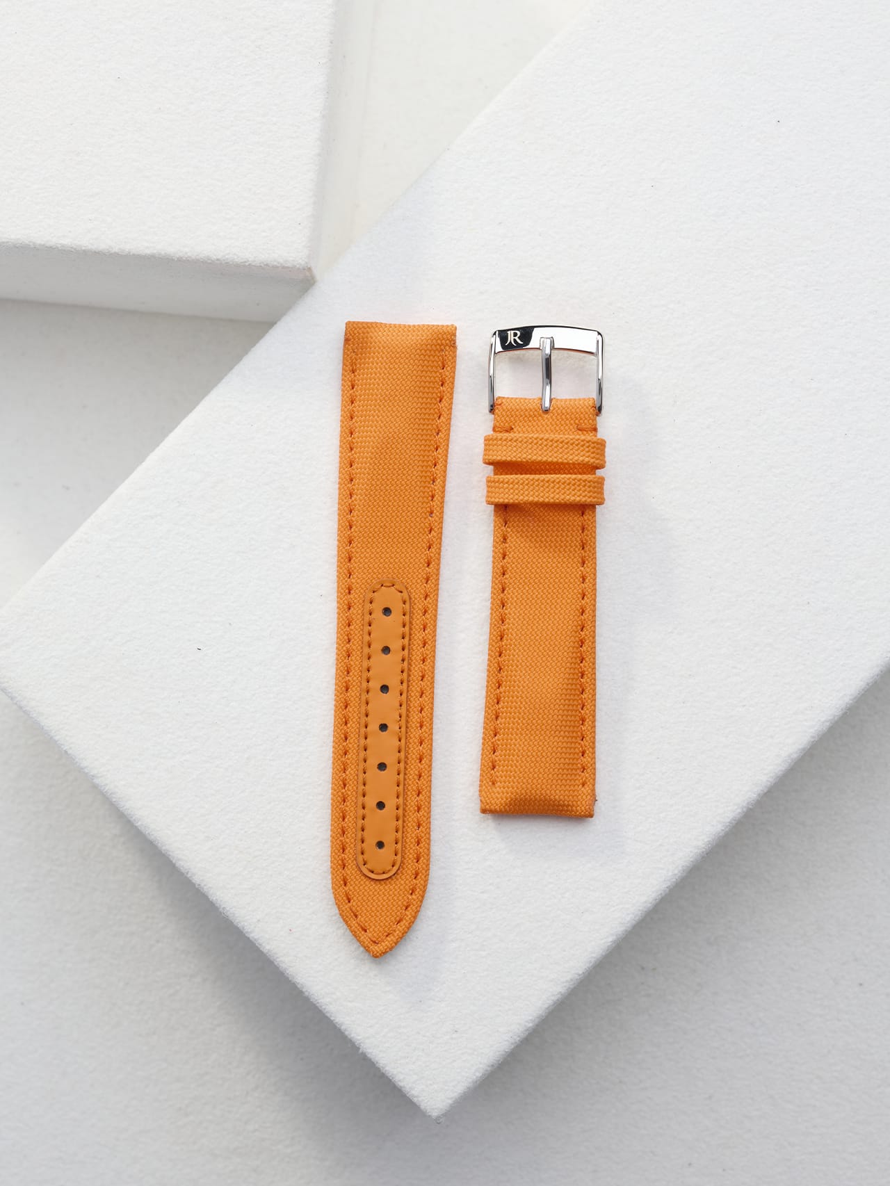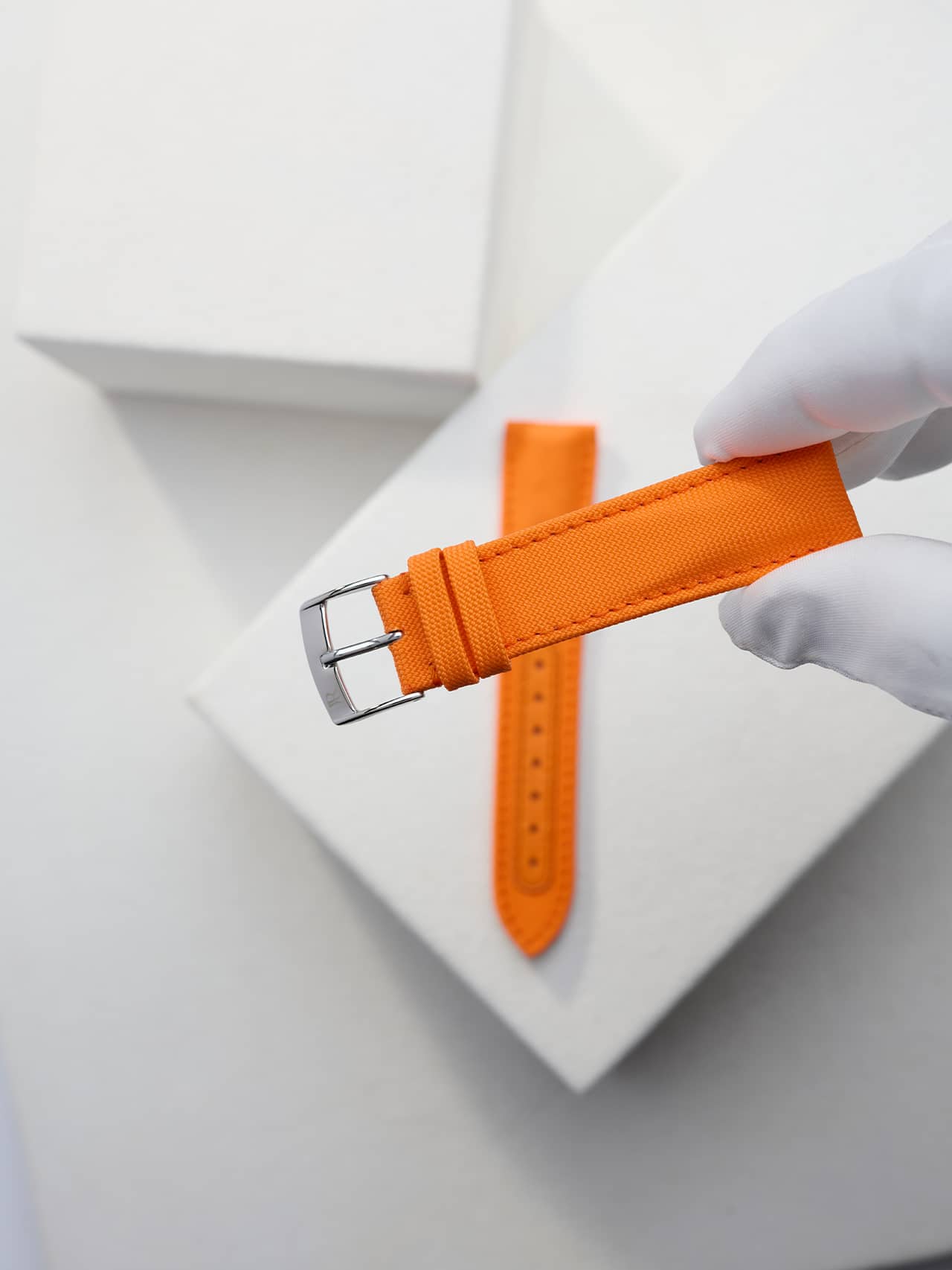 The orange Compass strap in technical fabric stands out with its slightly padded, stitched and turned at the edge. Made from technical fabrics and enhanced with rubber appliqués, this strap is the perfect companion for a sporty watch. Its bright orange hue adds a touch of freshness and energy while remaining resistant to outdoor conditions.