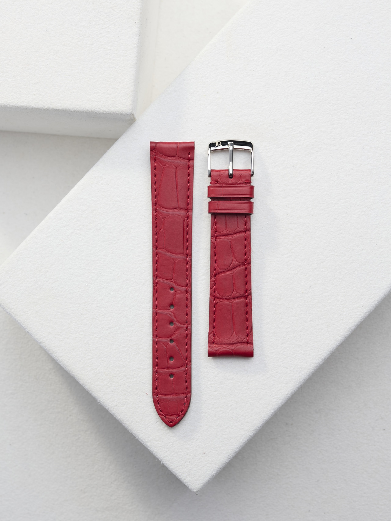 The carmine color highlights each natural scale in this semi matte alligator watch strap.
