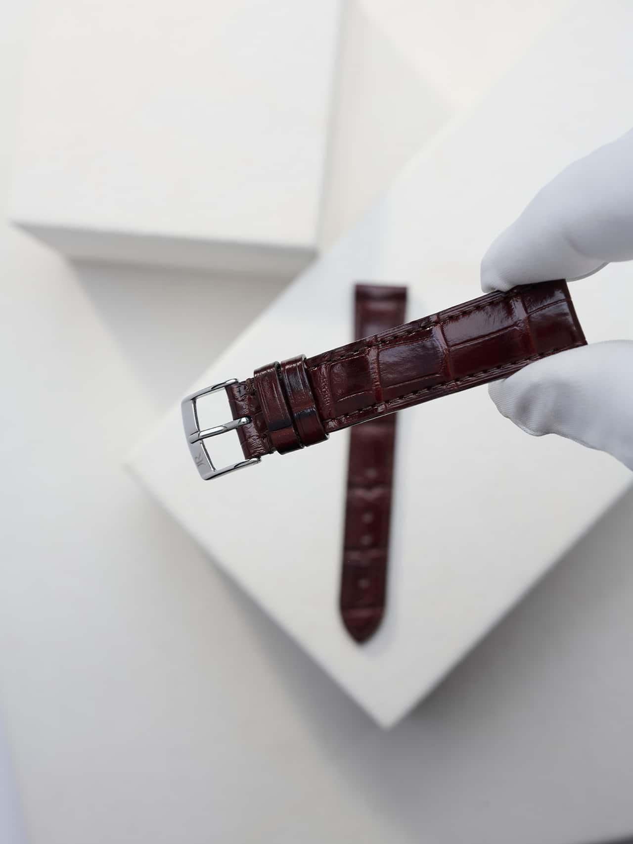 Jean Rousseau's Classic watch strap is slightly padded, with stitching and a cut edge. Our most versatile watch band can be fitted on your watch, and infinitely customized.